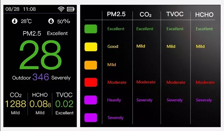 This superb air quality monitor provides precise & reliable PM1, 2.5, 10 inhalable micrometers particle, Total volatile organic compounds (TVOC), Formaldehyde (HCHO), Carbon Dioxide (CO2) readouts, as well as 6 of various sizes of air particle counter concurrently. Past 24 hours of tested measurement can be presented in the format of graphical trend for record tracing.